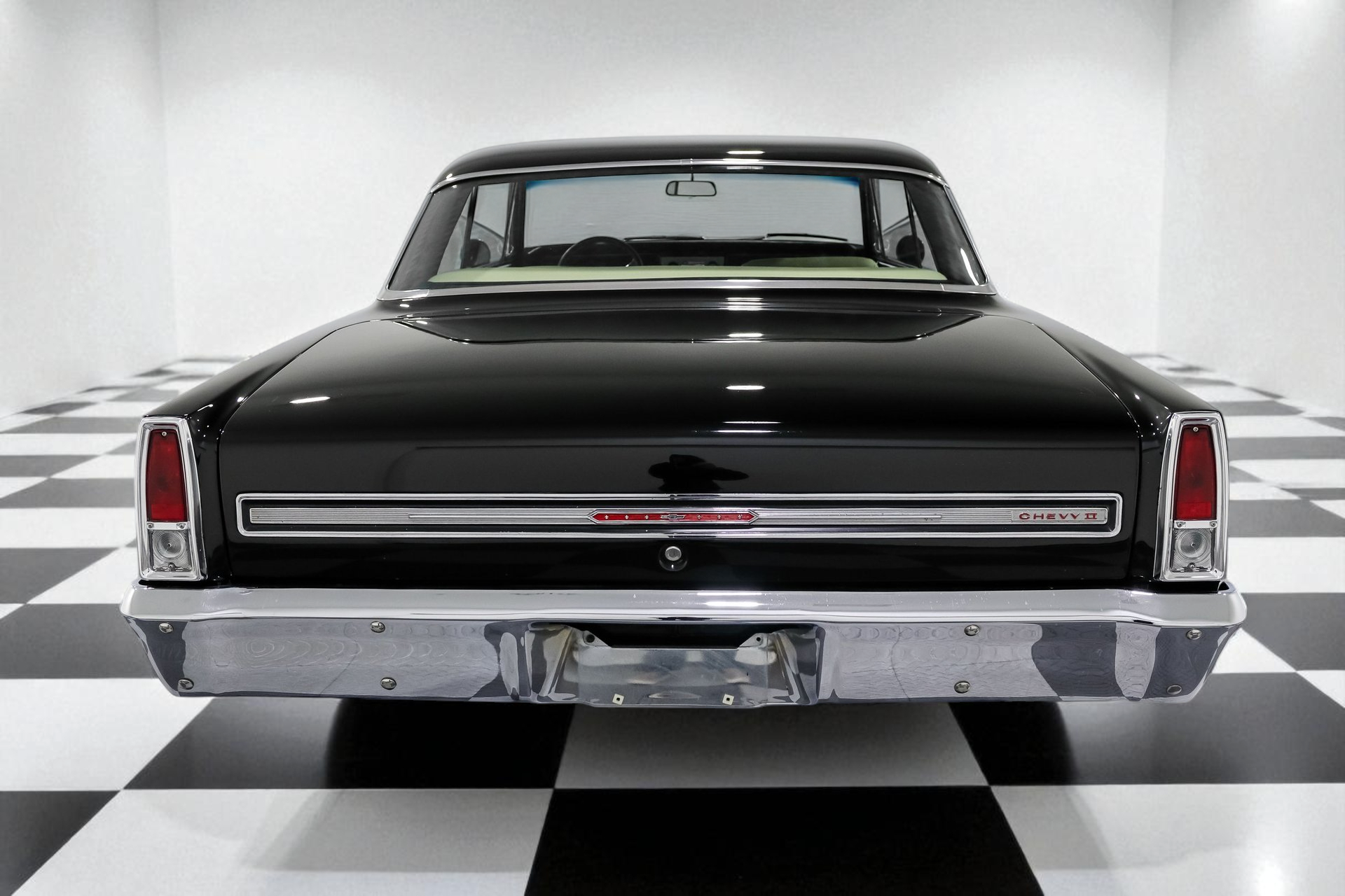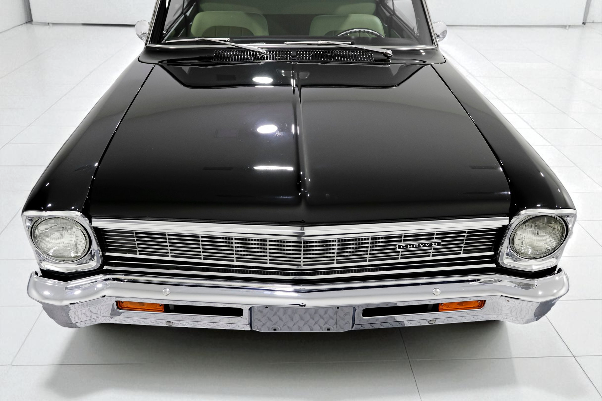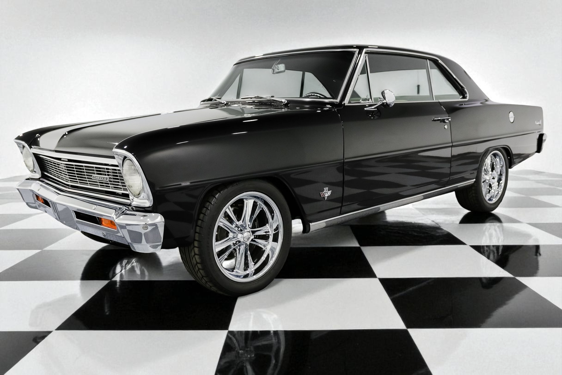 The 1966 Chevrolet Nova underwent a significant redesign, emerging with sharper lines and a more aggressive stance that set it apart from its predecessors. This particular Nova takes that bold spirit to the next level, cloaked in a menacing black finish that commands attention. Under the hood lies a potent 406 cubic inch V8, equipped with Vortec heads and a Howard hydraulic cam, delivering an impressive 430 horsepower and 495 lb-ft of torque at the crank.