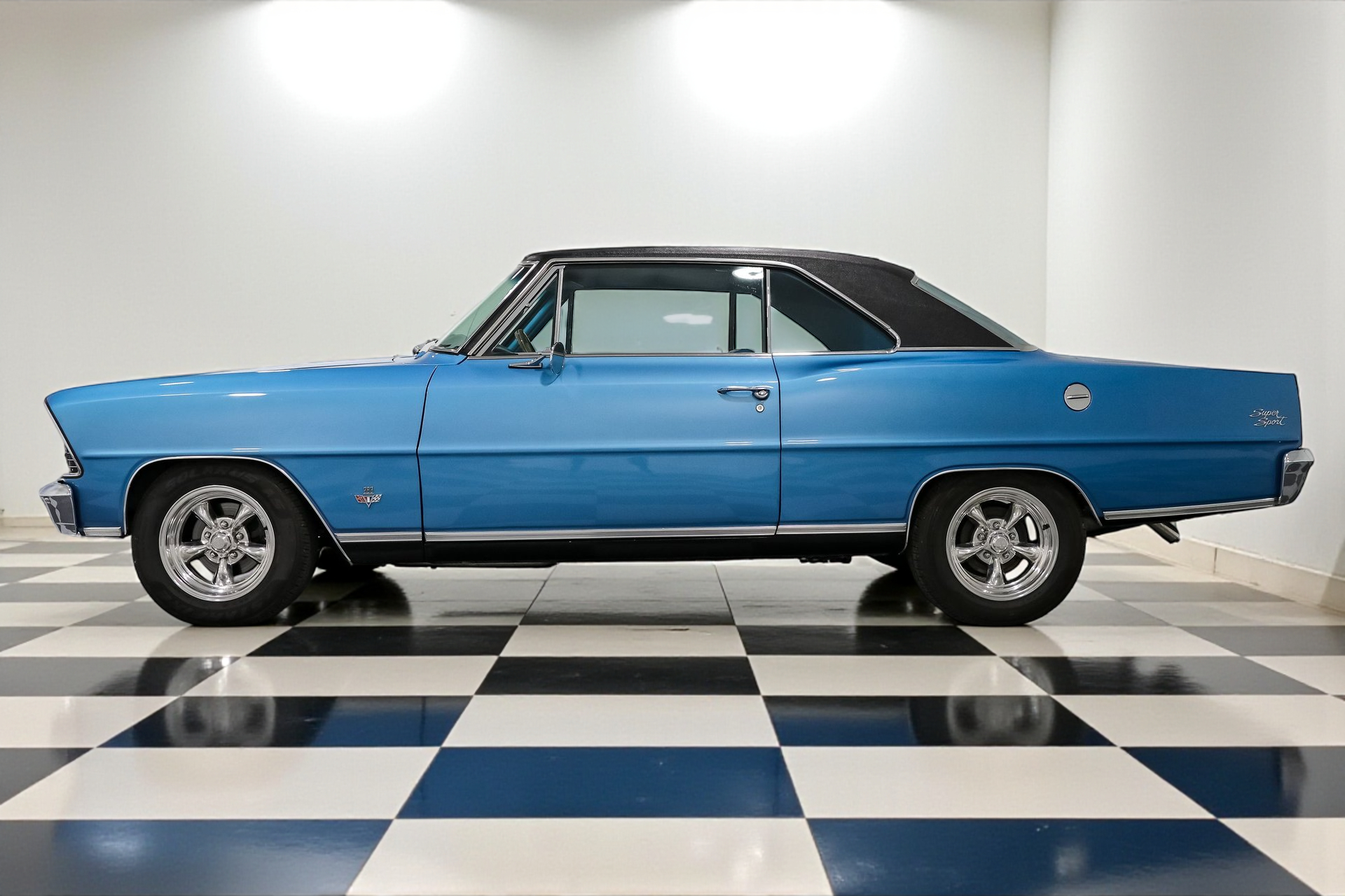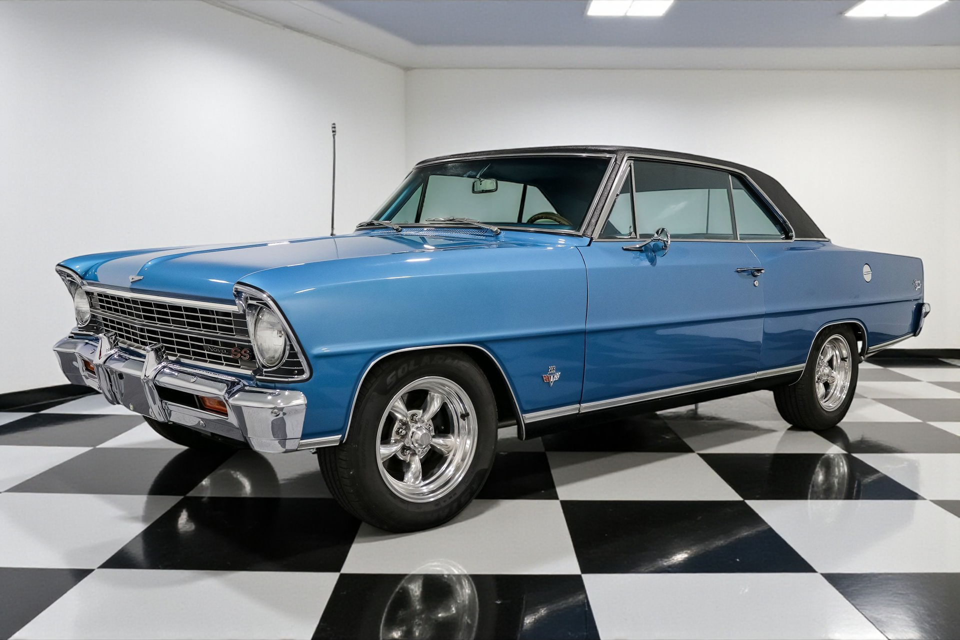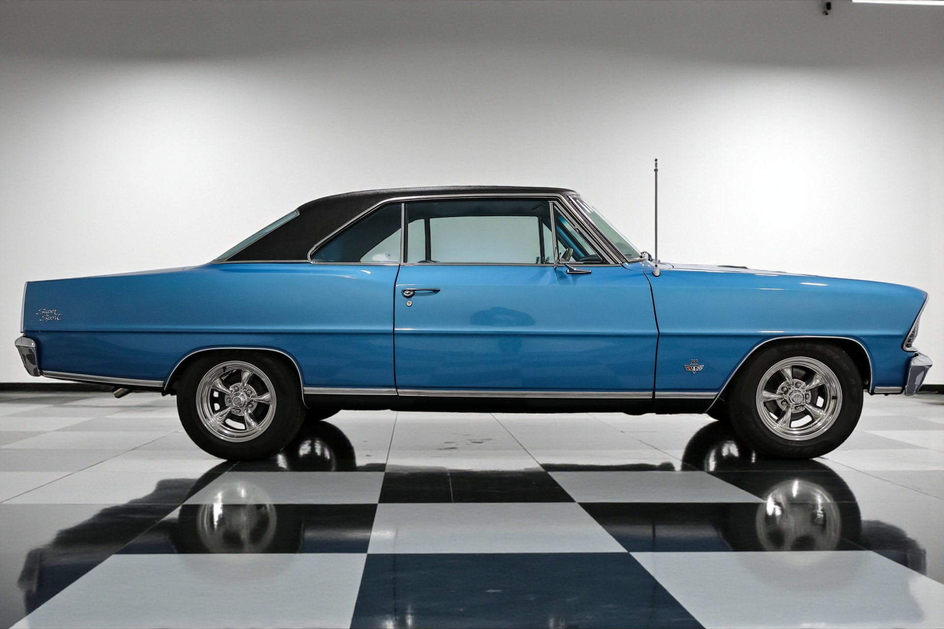 A true classic, this Nova SS is powered by a 283CI V8 engine coupled with a smooth 2-speed Powerglide automatic transmission, offering a perfect blend of vintage charm and performance. The striking Marina Blue exterior is complemented by a deluxe blue vinyl interior, showcasing the car's authentic and well-maintained condition.
