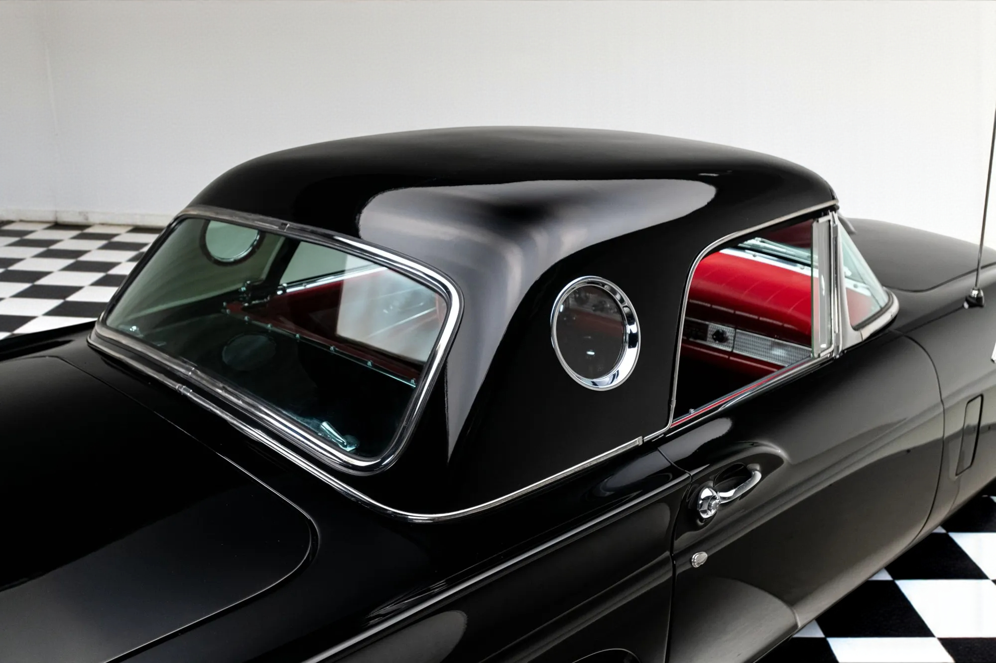 Dressed to impress in sleek black paired with a vibrant red interior, this Thunderbird captures the spirit of its era perfectly, blending iconic design with the thrill of open-air driving.