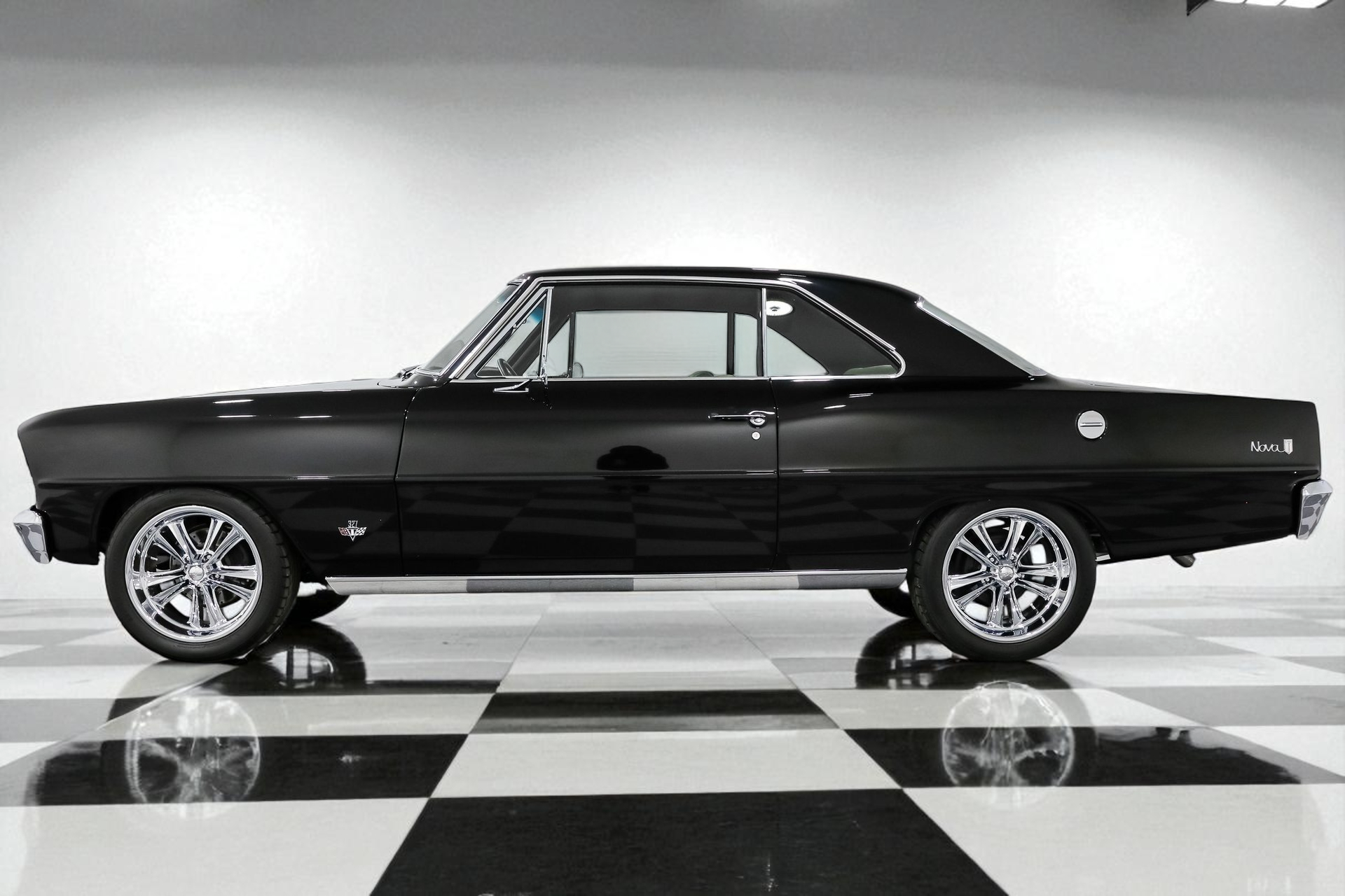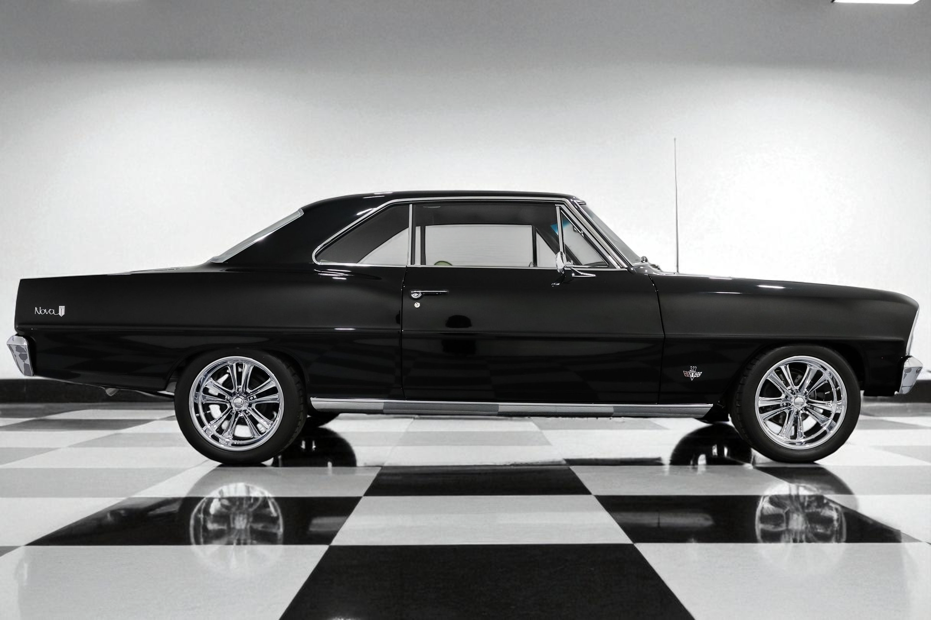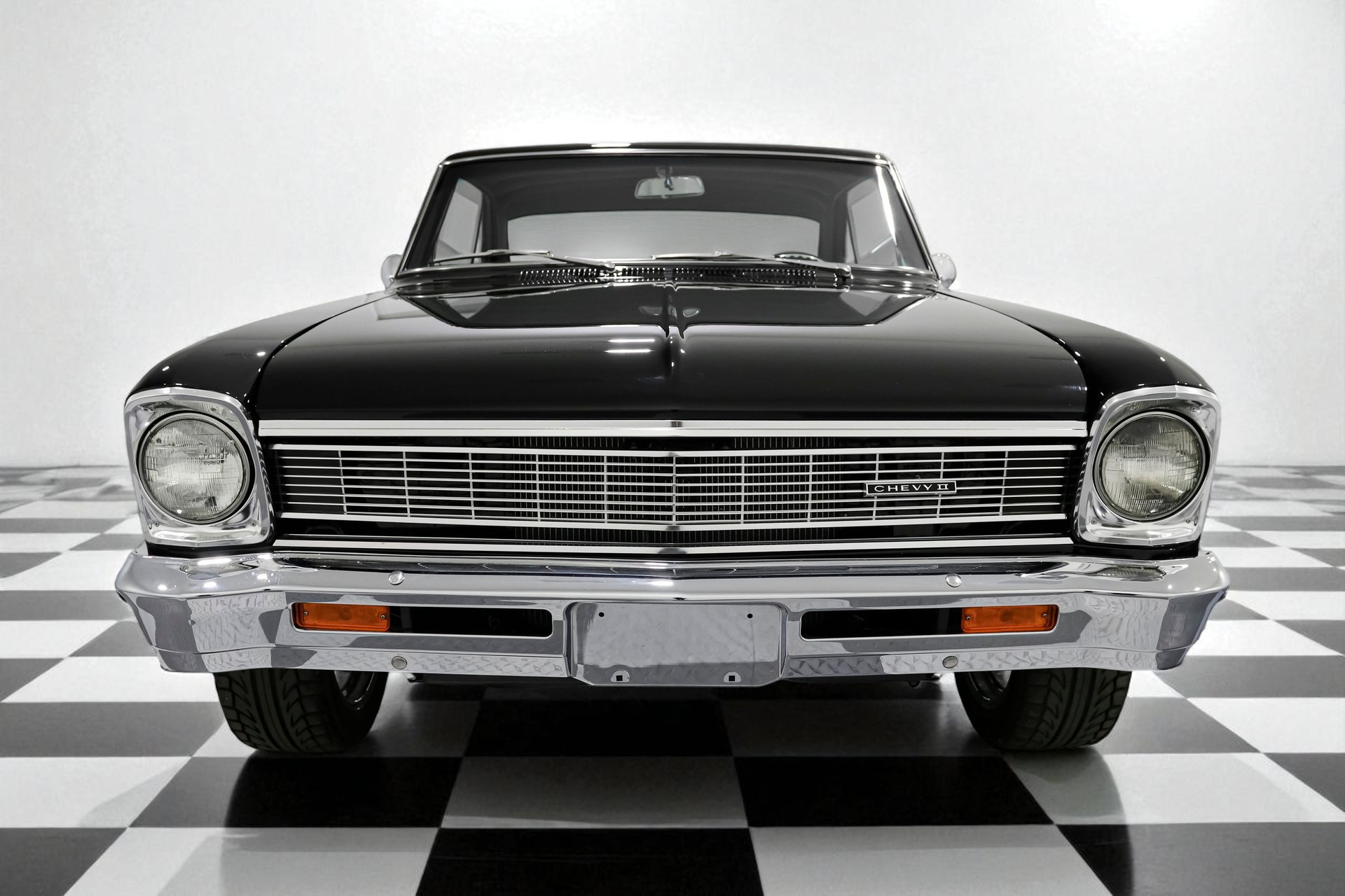 The 1966 Chevrolet Nova underwent a significant redesign, emerging with sharper lines and a more aggressive stance that set it apart from its predecessors. This particular Nova takes that bold spirit to the next level, cloaked in a menacing black finish that commands attention. Under the hood lies a potent 406 cubic inch V8, equipped with Vortec heads and a Howard hydraulic cam, delivering an impressive 430 horsepower and 495 lb-ft of torque at the crank.