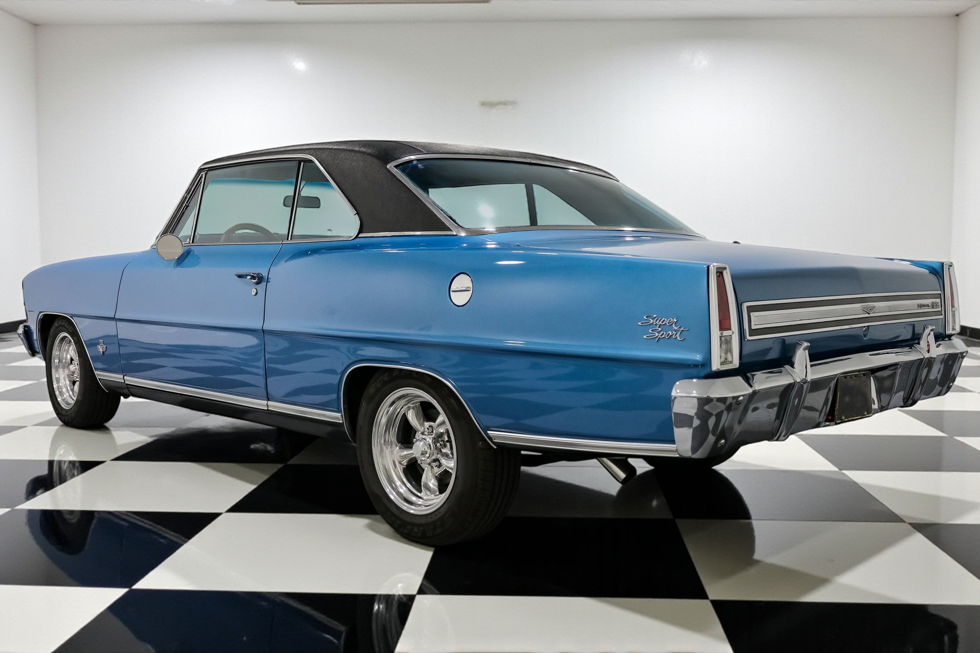 A true classic, this Nova SS is powered by a 283CI V8 engine coupled with a smooth 2-speed Powerglide automatic transmission, offering a perfect blend of vintage charm and performance. The striking Marina Blue exterior is complemented by a deluxe blue vinyl interior, showcasing the car's authentic and well-maintained condition.